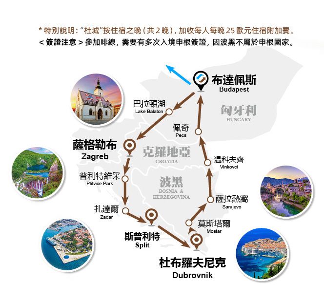 (特別說明:啡線杜城(Dubrovnik)2 晚因其當地的酒店成本昂貴,於報名時須按住宿之晚數,加收每人每晚20 歐元的住宿附加費!)