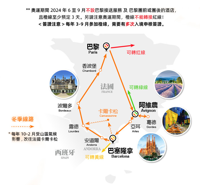 注意:2024 由 6 至 9 月“巴黎奥運期間” 【橙線】最少預訂天數:為3天!同時亦不設巴黎接送服務及巴黎團前或團後的酒店住宿!