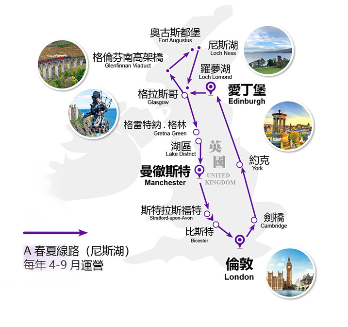 | 每週二 | 紫線 → 愛丁堡 | 17:00 | 愛丁堡 Waverley 火車站 |