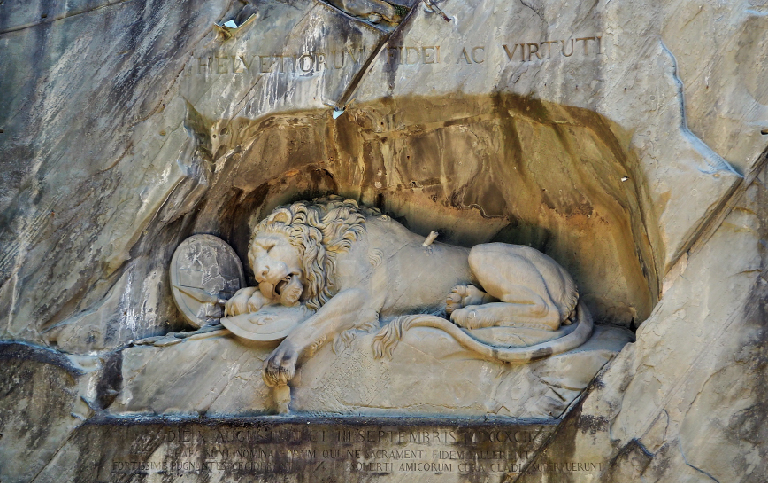 這座由丹麥雕塑家巴特爾·托瓦爾森設計的垂死獅子雕像,用以紀念1792年保衛巴黎杜伊里宮戰役的英雄-瑞士僱傭兵團。獅子像的表情哀戚、身形刻劃生動,知名小說家馬克吐溫稱其為「世界上最令人悲傷和感動的石像」。